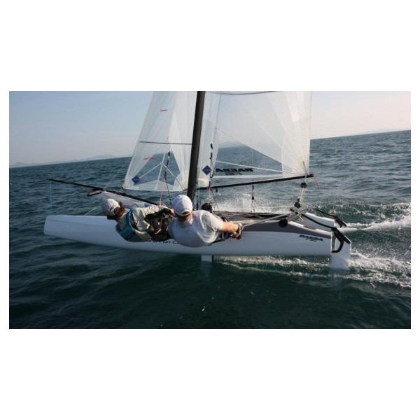 La plate-forme assemblée par insert procure également une importante solidarité entre les flotteurs et limite ainsi les pertes de puissance. La complémentarité foc, grand voile Pentex et spi a été étudié pour élaborer un gréement encore plus performant.